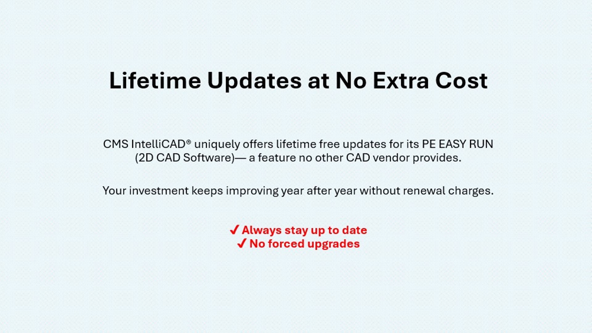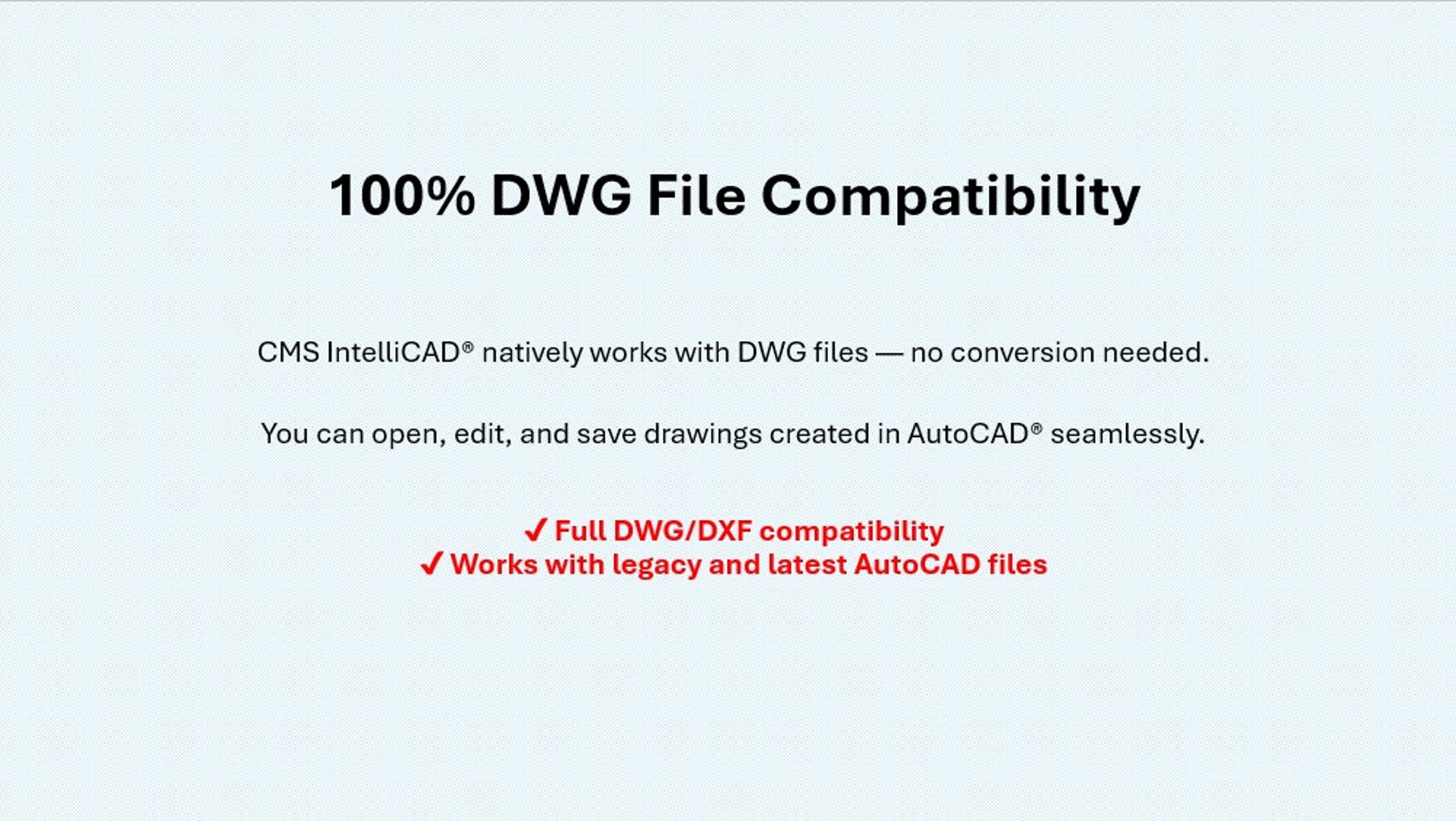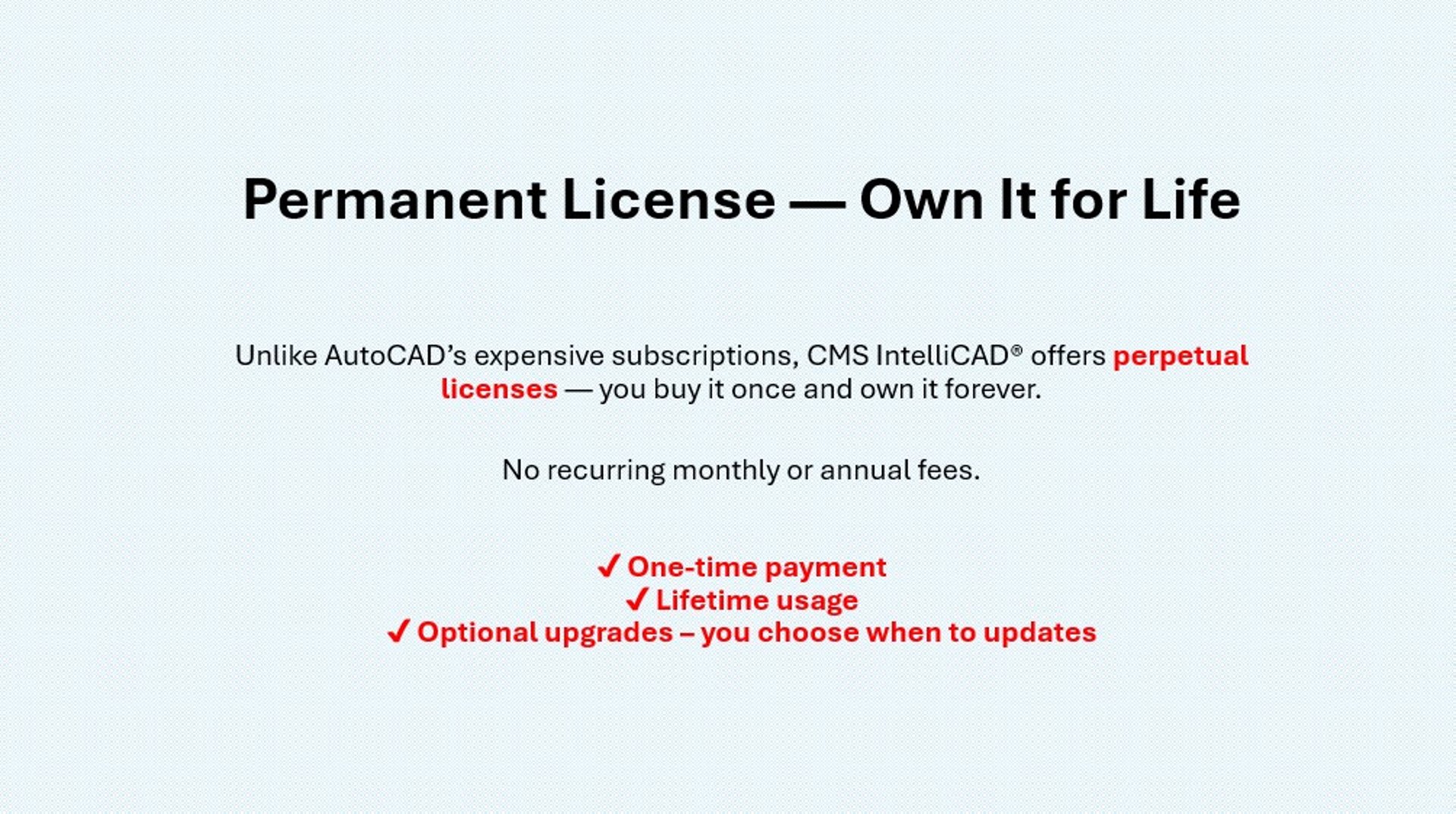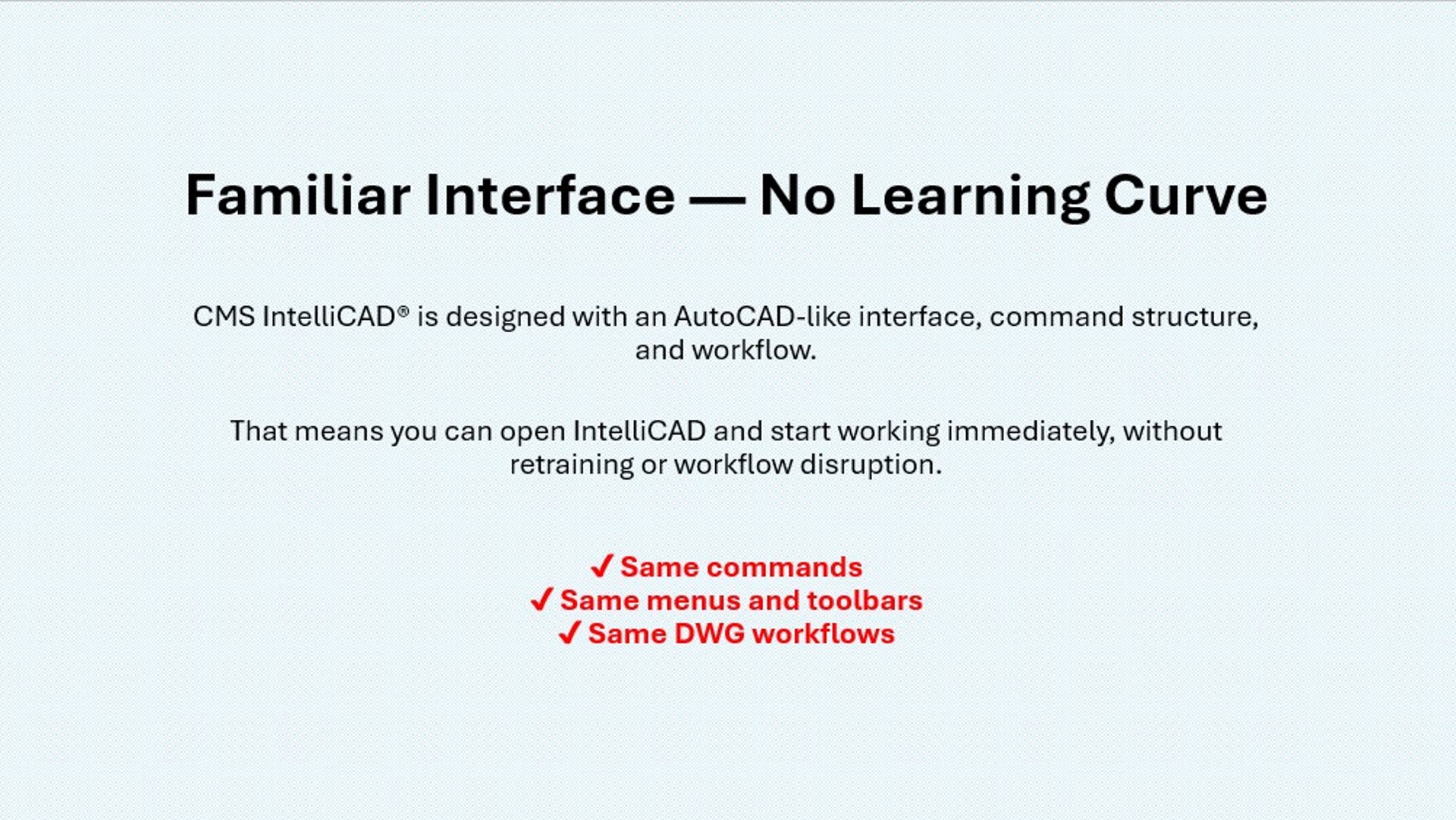 If you’ve been using AutoCAD® for years, you already know it’s a powerful tool — but you also know how expensive and restrictive it has become. CMS IntelliCAD® offers the same familiar experience, full DWG compatibility, and advanced CAD performance — without the heavy cost and license limitations.