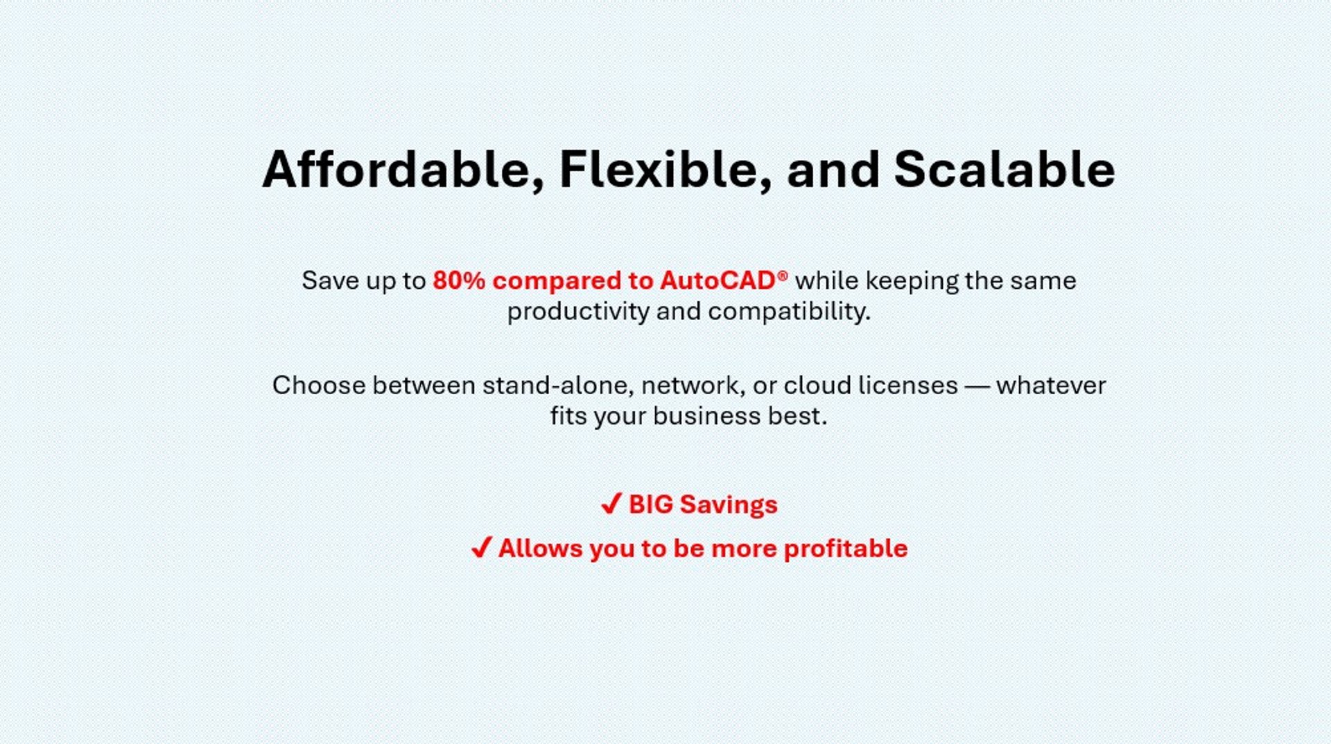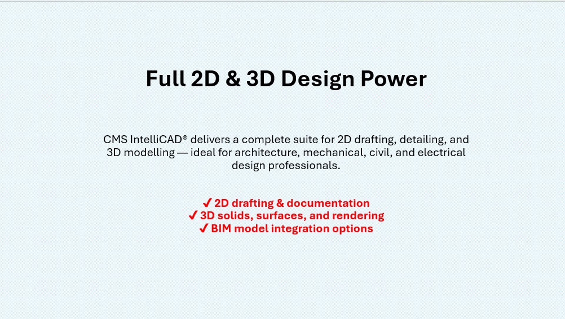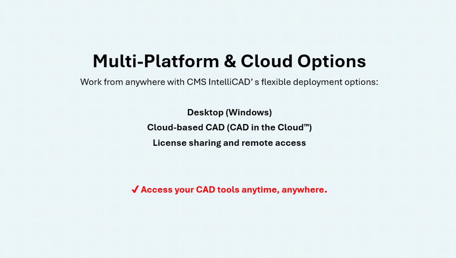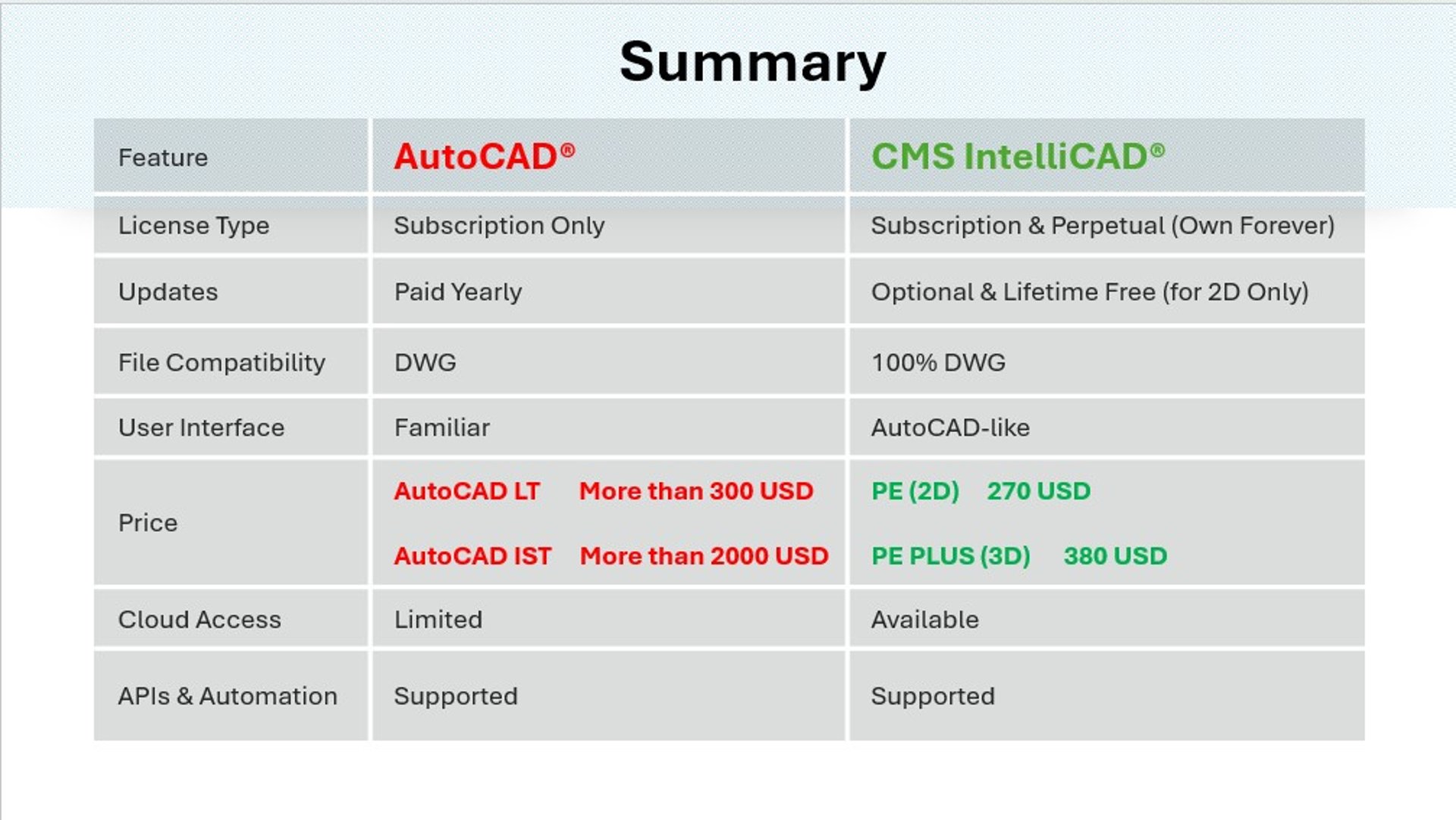 If you’ve been using AutoCAD® for years, you already know it’s a powerful tool — but you also know how expensive and restrictive it has become. CMS IntelliCAD® offers the same familiar experience, full DWG compatibility, and advanced CAD performance — without the heavy cost and license limitations.